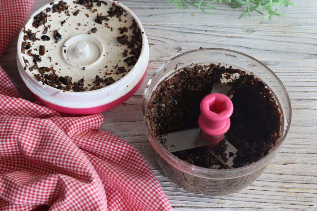 • Pongo en la picadora manual las aceitunas sin hueso. Yo he utilizado las taggiasche, pero seguro que también las de Gaeta o las aceitunas griegas irán muy bien. Las he reducido casi a crema.