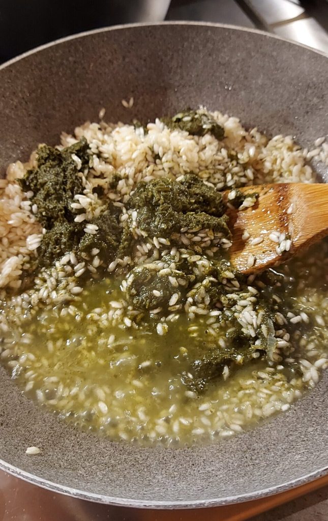 • Añado las espinacas previamente hervidas y trituradas. A medida que se seca el risotto, añado un poco de caldo de a poco.