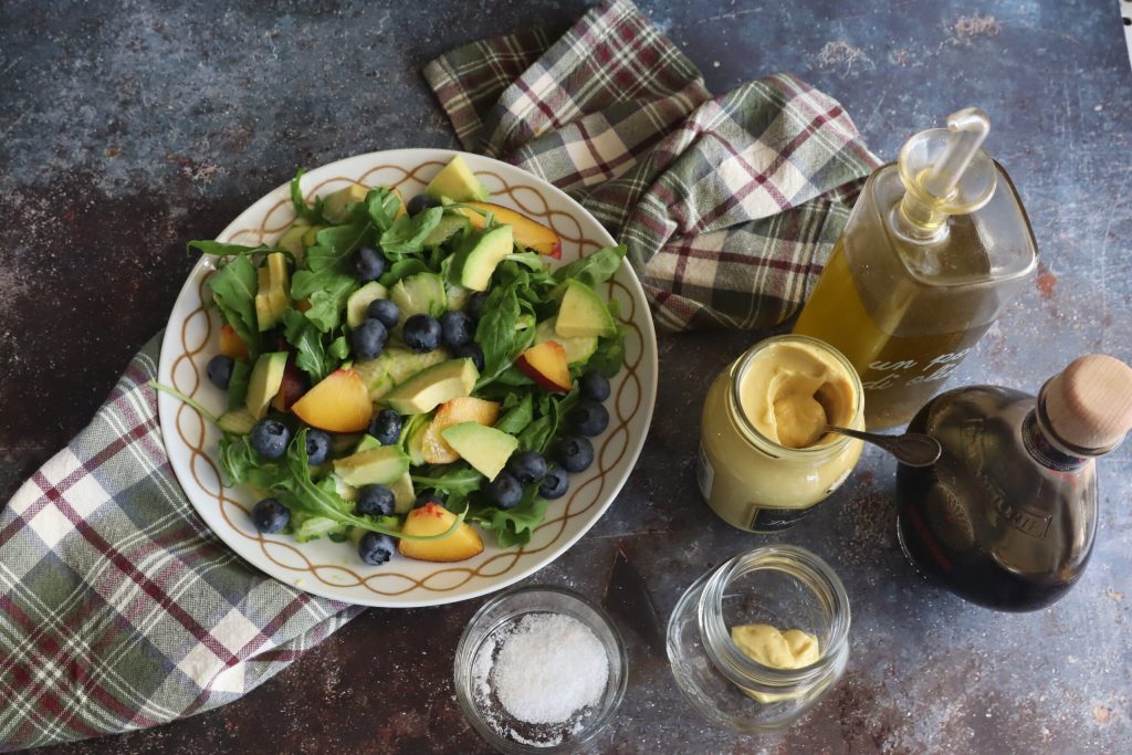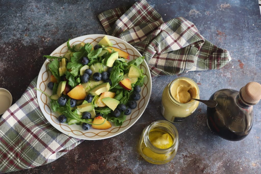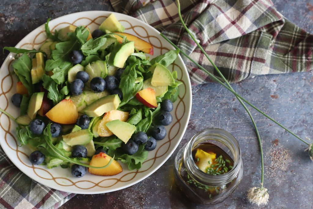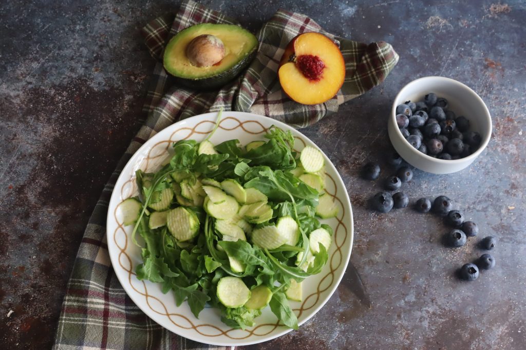 Verted encima de la rúcula con los arándanos, el aguacate y el melocotón. Servid inmediatamente.