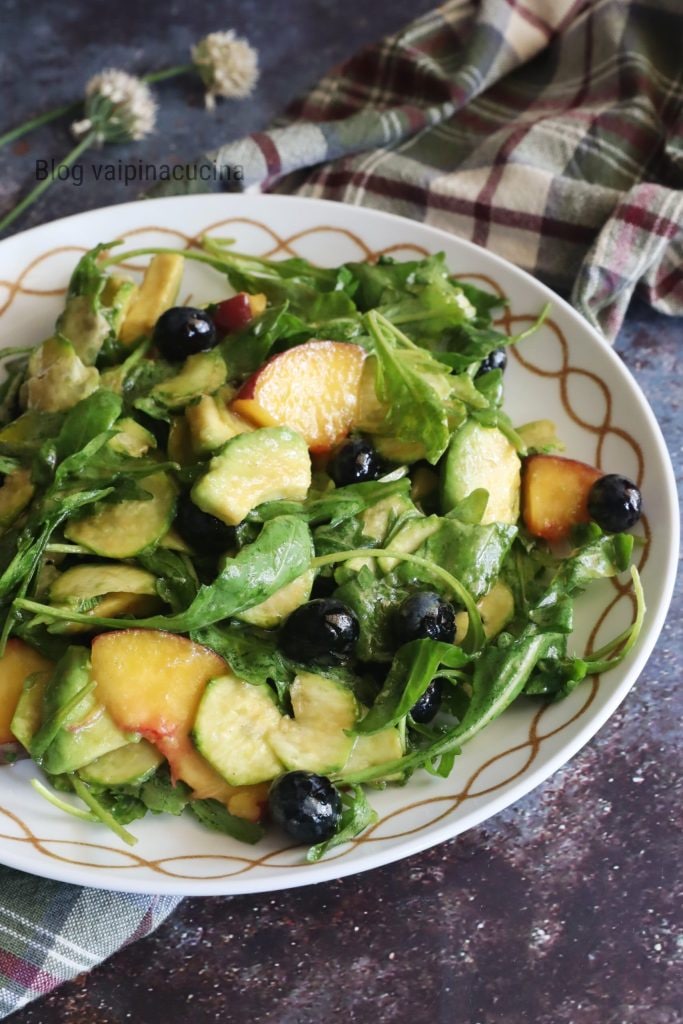 Rúcula, arándanos y aguacate: una súper ensalada, más bien un segundo plato o un plato completo por todos los ingredientes. No os sorprendáis si, sobre la estacionalidad, he añadido, además del verano, todas las estaciones. La razón es sencilla: estos ingredientes míos, que encuentro en verano, en realidad están disponibles todo el año. Claro, luego nos toca a nosotros elegir la estacionalidad. A partir de la rúcula, que es una planta herbácea anual con un sabor amargo, casi picante. En realidad, se puede utilizar tanto cocida como cruda para platos como primeros o segundos, como guarnición o decoración para platos únicos. Así como el aguacate, que se encuentra todo el año, o los arándanos.