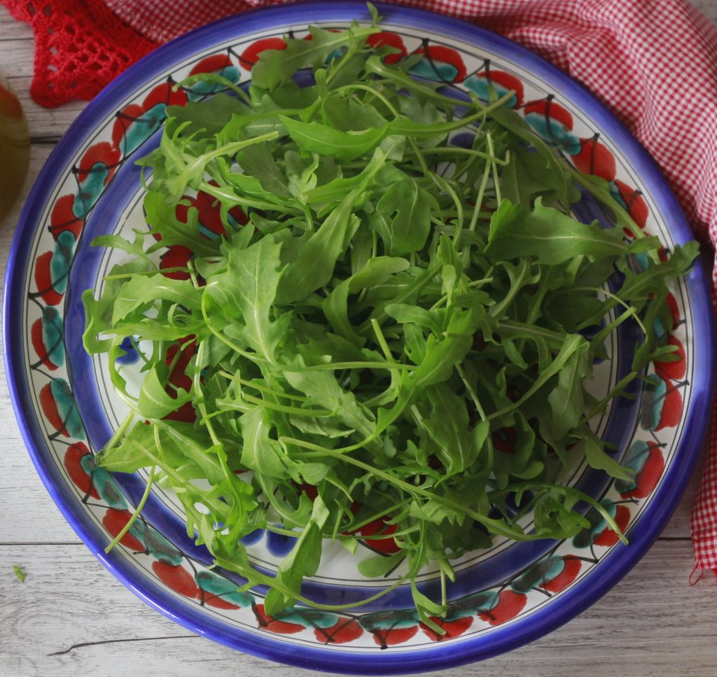 Plato fresco, veraniego y naturalmente ligero. Y esto incluye seguramente la rúcula, una verdura que adoro y que consumo siempre cuando es la temporada, es decir, siempre, porque es una planta anual.
