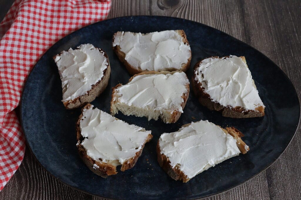 • Unté el queso fresco en cada rebanada de pan casero tostado ya más que tibio.