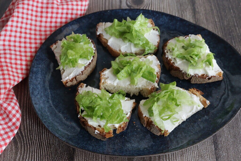 • Sólo hacen falta unas hojas de ensalada, después de lavarlas cuidadosamente y secarlas, las corto en juliana y las distribuyo sobre todas las rebanadas ya con el queso para untar.