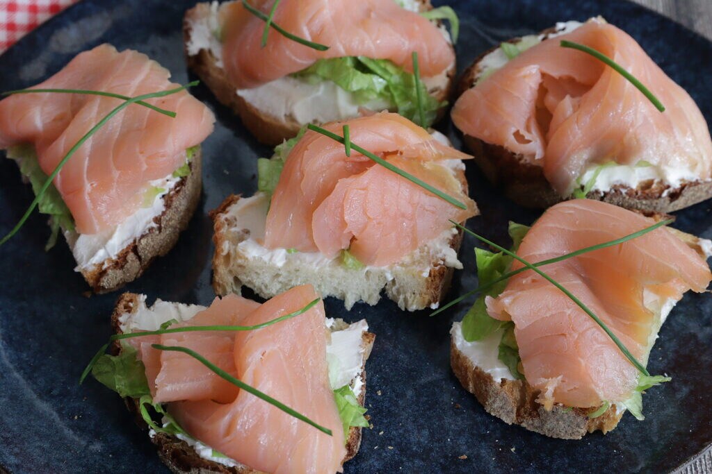• Coloco una loncha de salmón ahumado encima de cada rebanada de pan con queso fresco para untar y ensalada y el plato está listo.