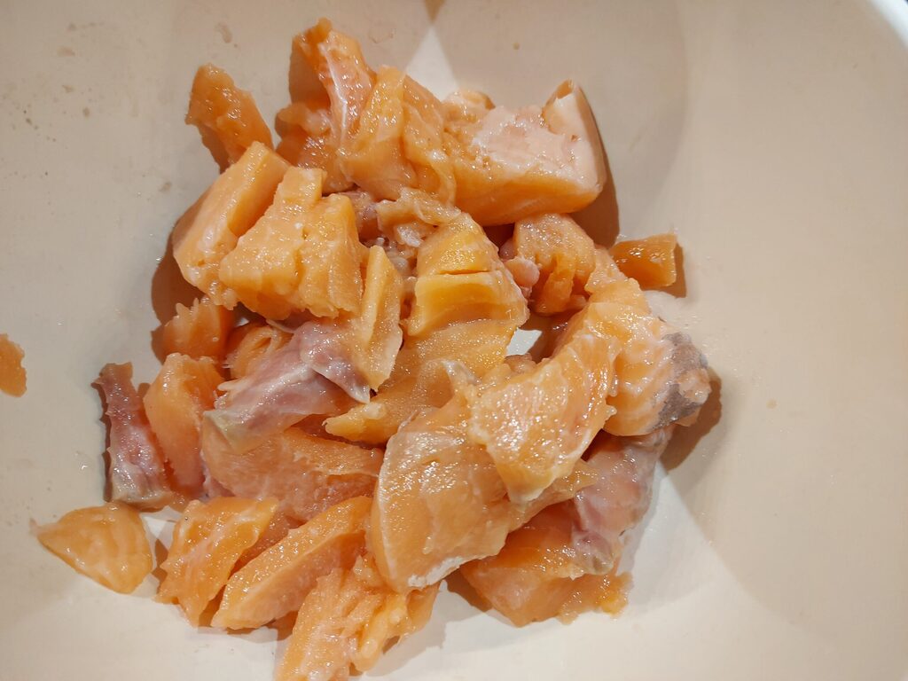 Cortad el salmón con el cuchillo en pequeños trocitos y de igual manera cortad también los calamares.