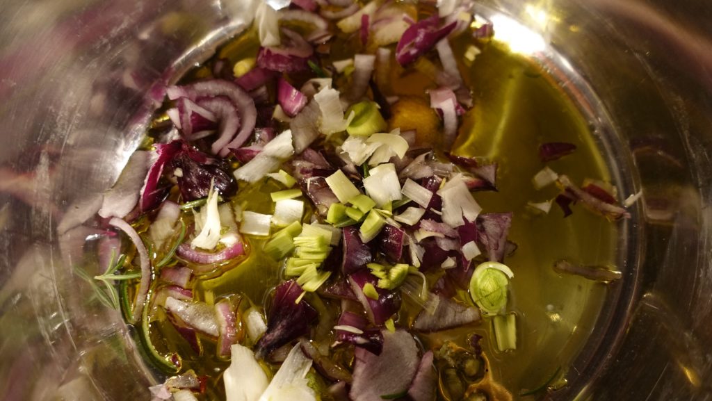 • Vierte dos cucharadas de aceite en una cazuela grande y pocha la cebolla con el puerro. Añade las zanahorias, el apio y las patatas, todo cortado en trozos, naturalmente, y por último los topinambur.