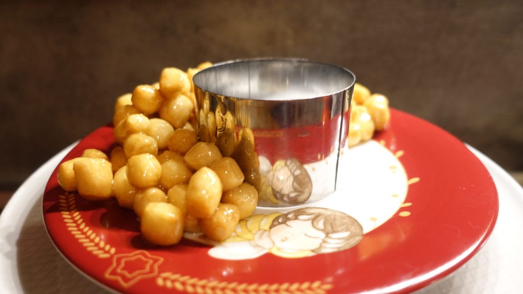 • Con dos cucharas comienza a colocar los struffoli alrededor del molde redondo.