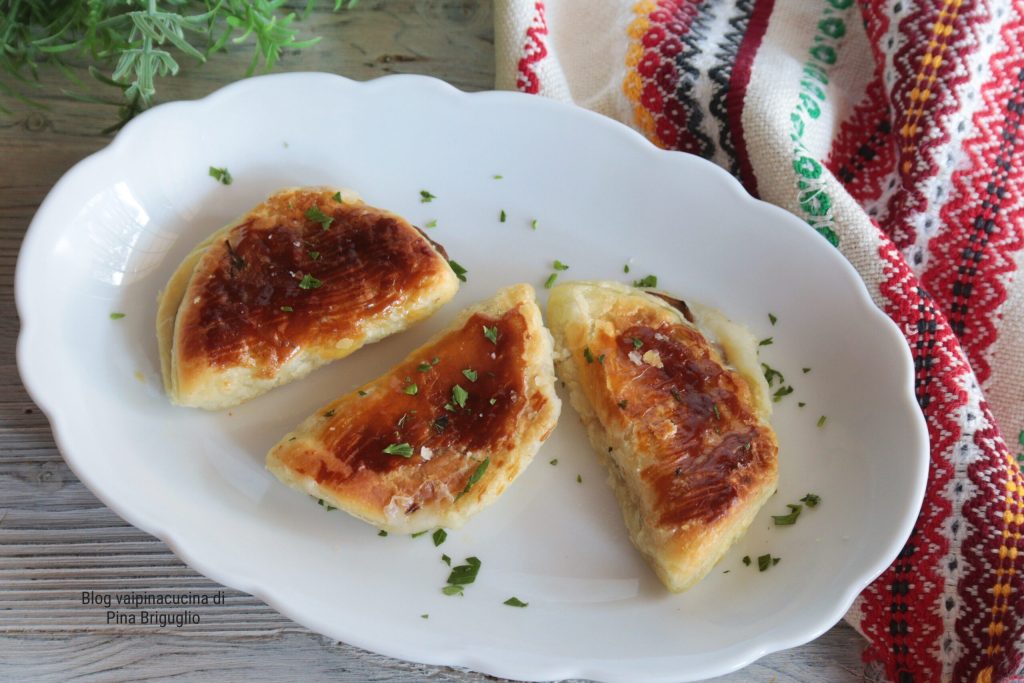 Sobre cada disco de hojaldre colocad una rodaja de berenjena y un trocito de provola; cerradlo como si fuera un taco.