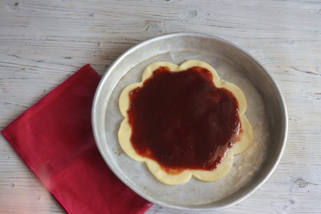 Con el rodillo extendí la masa quebrada y con el cortapastas de flor de 22 cm. hice una base de masa quebrada con forma de flor. Vertí encima una buena cantidad de mermelada de ciruelas.