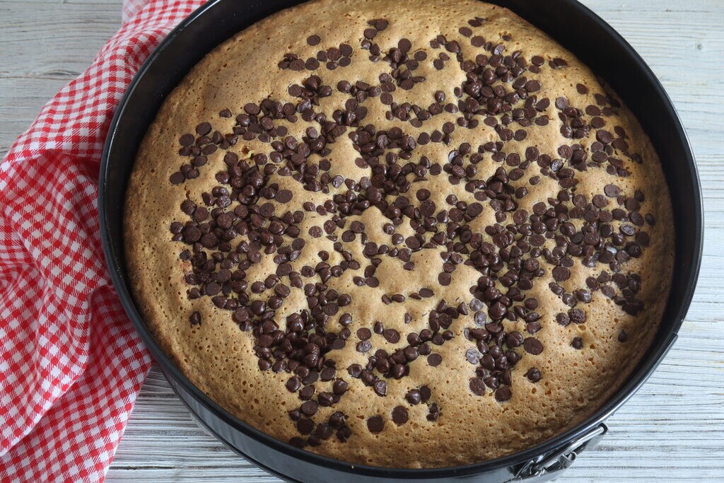 • vierto en el molde enmantecado y enharinado. Cubro la tarta de calabaza y almendras con abundantes gotas de chocolate.