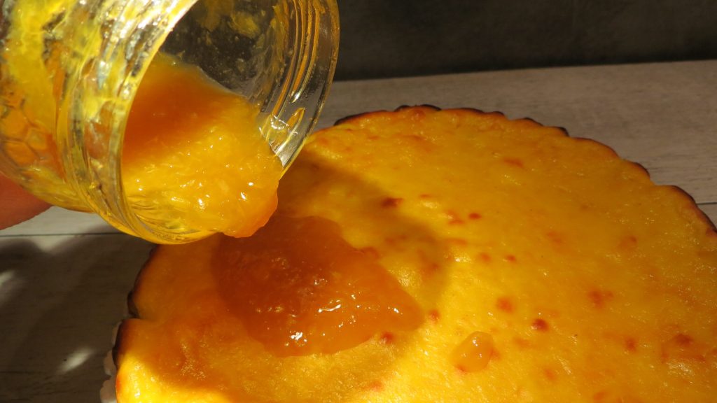 Dejo enfriar ligeramente la tarta de copos de maíz y la espolvoreo con mermelada de naranjas