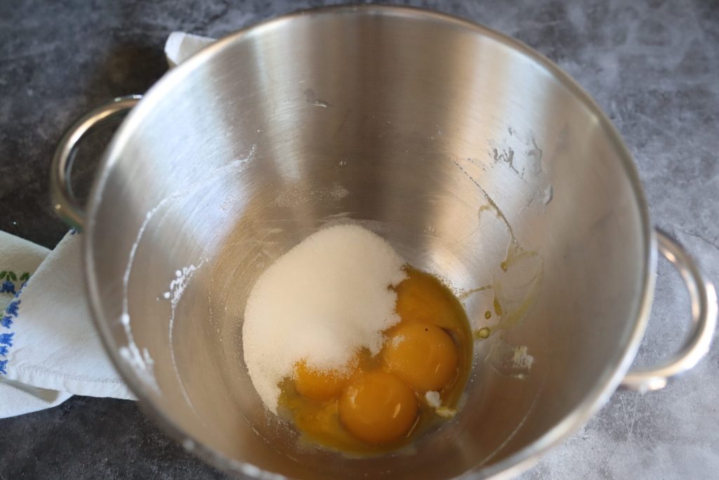 • Sin necesidad de lavar la batidora planetaria, retiradas las claras, pongo el azúcar con las yemas.