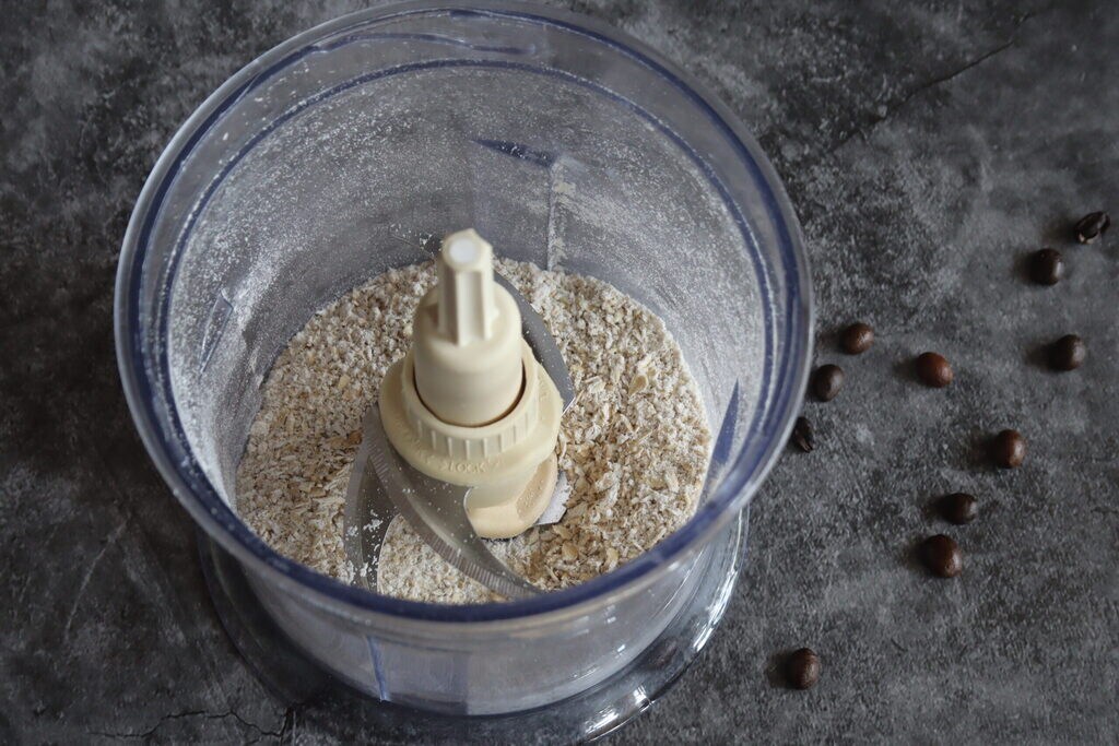 Para preparar la tarta en taza avena y café necesitas la picadora para mezclar todos los ingredientes. Como primer paso, tritura los copos de avena y redúcelos a harina.