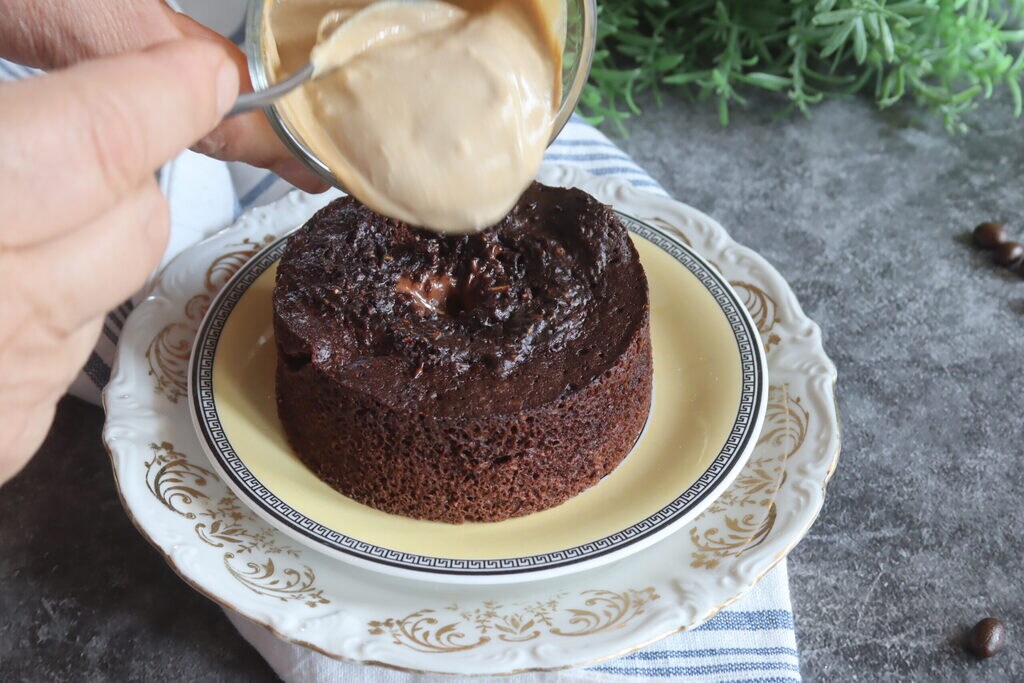Saca la taza del microondas y coloca un trocito de chocolate en el centro, empújalo hacia abajo.