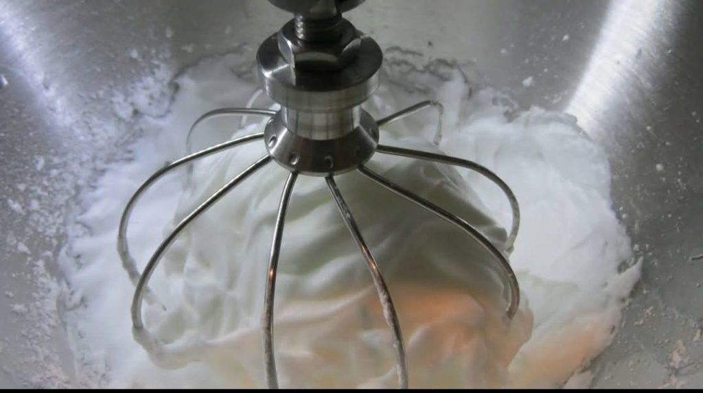 Mientras tanto, monto en la batidora las claras con el azúcar glas y una pizca de sal. Para asegurar mi merengue, llevo a ebullición 50 g de agua en la que he disuelto 170 g de azúcar, cuando la temperatura ha alcanzado los 120°, siempre mezclando y en hilo, la he añadido (aún caliente) a las claras montadas a punto de nieve.
