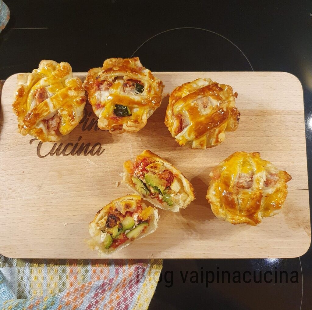 En un cazo preparo el tomate con aceite de oliva virgen extra, sal, ajo y albahaca, y mientras tanto lo dejo cocinar durante 15 minutos. Mientras tanto, lavo y corto los calabacines en cuadritos, los sazono con sal y aceite de oliva virgen extra y los pongo a cocinar en el microondas en modo Crisp en una bandeja con papel de horno durante 8 minutos. Rallo el queso y preparo el feta cortado en trocitos. Extiendo el hojaldre rectangular y lo corto en 6 partes dejando algunos trozos para preparar las tiras de las tartaletas. Después de cortarlas con todo el papel de horno, colócalas en el molde para muffins y comienza a ensamblar los ingredientes. En la primera capa, coloca una cucharada de tomate, continúa con una cucharada de calabacín, feta, parmesano y nuevamente los calabacines. Ahora cierra con una capa de tomate con parmesano rallado y comienza a colocar 4 tiras de hojaldre cruzadas sobre las tartaletas. Con la yema, pinta toda la superficie de las tartaletas, ponlas en el horno ya caliente a una temperatura de 170° durante 25 minutos.