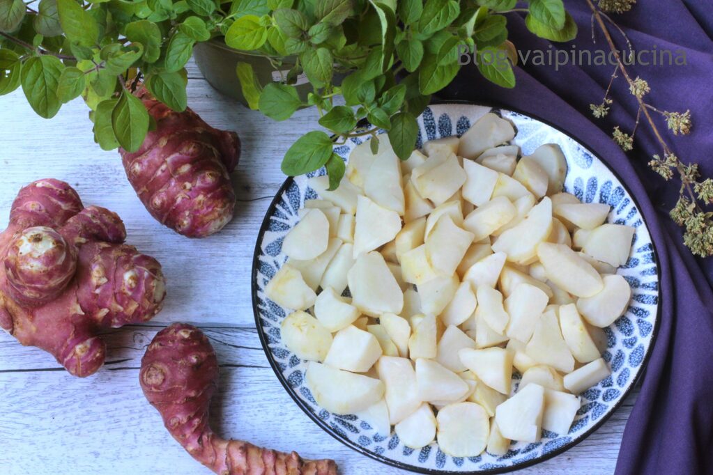 Topinambur en aceite, ya conocemos todas o casi todas las propiedades beneficiosas de los topinambur, para quien lo descubre ahora, este maravilloso tubérculo, os remito a la lectura en mi blog.giallozafferano.it/vaipinacucina para obtener información sobre el tubérculo en cuestión en la receta de risotto al topinambur. Es sabido que todas las verduras se pueden preparar en aceite, pero el topinambur en aceite ha sido una verdadera sorpresa para mí, buenísimo, no creo que lleguemos a consumirlo para Navidad con todos los entremeses, es demasiado bueno para esperar. Un acompañamiento simple y rápido y prepararlo en aceite es muy sabroso. Con una breve búsqueda en internet he aprendido que el topinambur contiene poco níquel, así que ¡adelante, para quien como yo tiene esta intolerancia! Pero no exageréis, ¡no he dicho que no tiene!