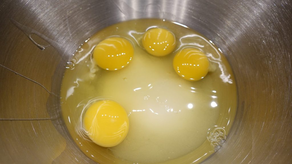 Poner en la batidora los huevos con el azúcar. Debe triplicar su volumen si quieres un tronco esponjoso y voluminoso.