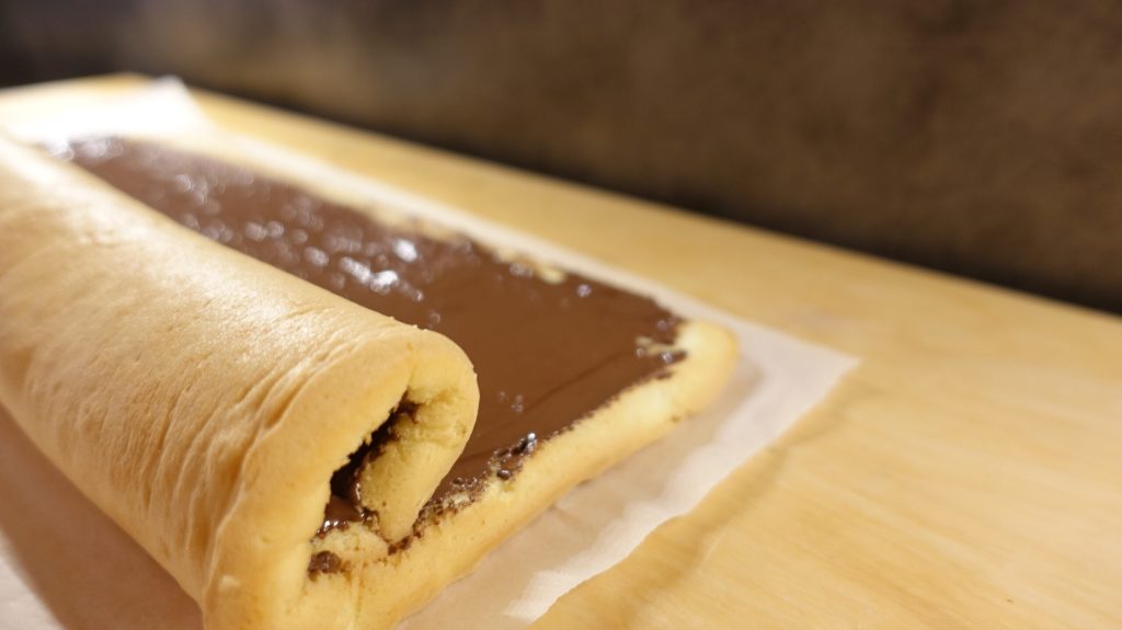 Quitar el papel para hornear pegado a la base del tronco. Untar una capa de crema de avellana.