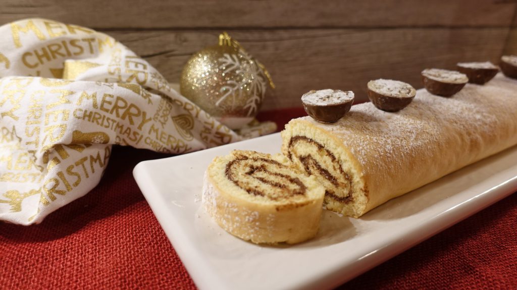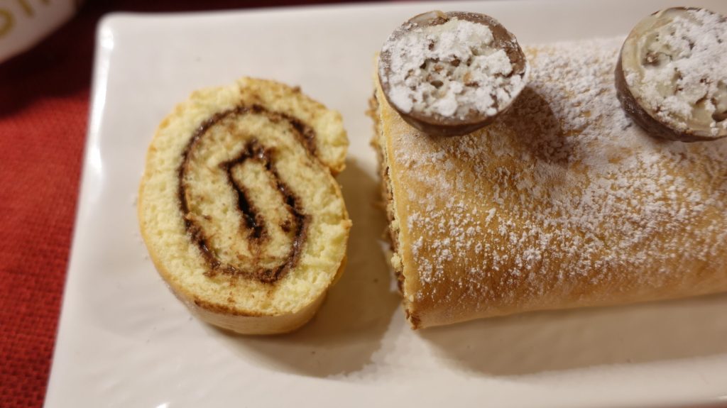 Tronco con crema de avellanas, fantástico. Podría convertirse en un tronco de Navidad para el postre después de la comida. Un dulce para noches de fiesta y no solo, despreocupadas, esas en las que si hay un dulce siempre es bienvenido. El tronco con crema de avellanas es rápido y está listo con solo tres ingredientes huevos-azúcar-harina. He probado a prepararlo con y sin levadura, solo una cucharadita, una insignificancia, el resultado no cambia mucho. Lo que lo hace esponjoso y voluminoso no es más que el aire que incorpora en el momento de la preparación con la batidora. Exactamente el mismo criterio que el bizcocho que se prepara sin levadura, a ustedes la elección de usarla o no.