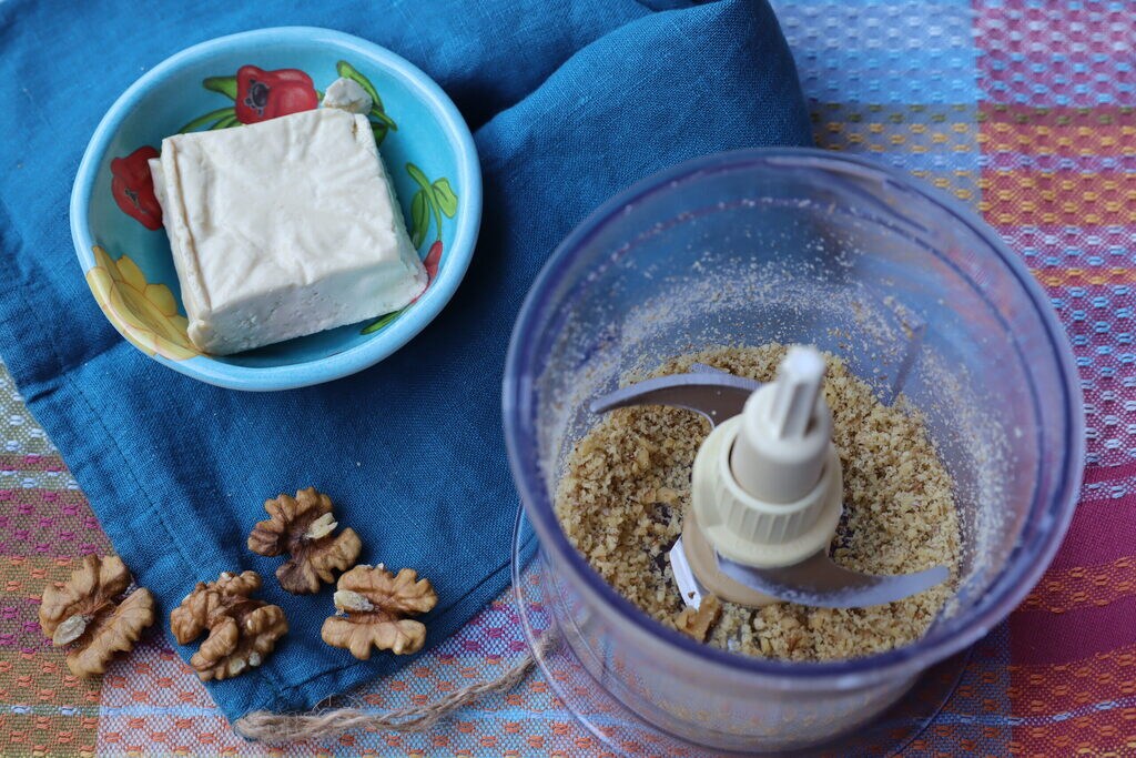 Como primer paso, pica las nueces, añade el tofu desmenuzado a mano, una pizca de sal y guindilla y por último el aceite.