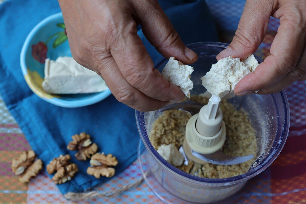 Como primer paso, pica las nueces, añade el tofu desmenuzado a mano, una pizca de sal y guindilla y por último el aceite.