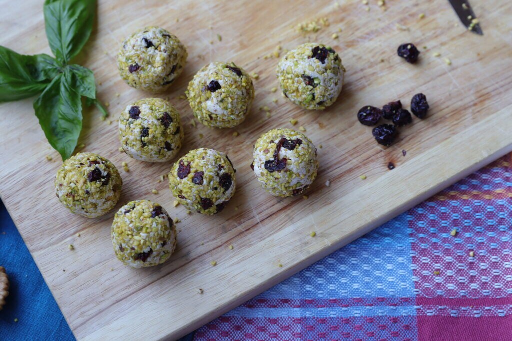 Pica los pistachos y corta en pequeños trozos los arándanos rojos deshidratados, luego rueda las pequeñas trufas sobre los pistachos y arándanos para cubrirlas.