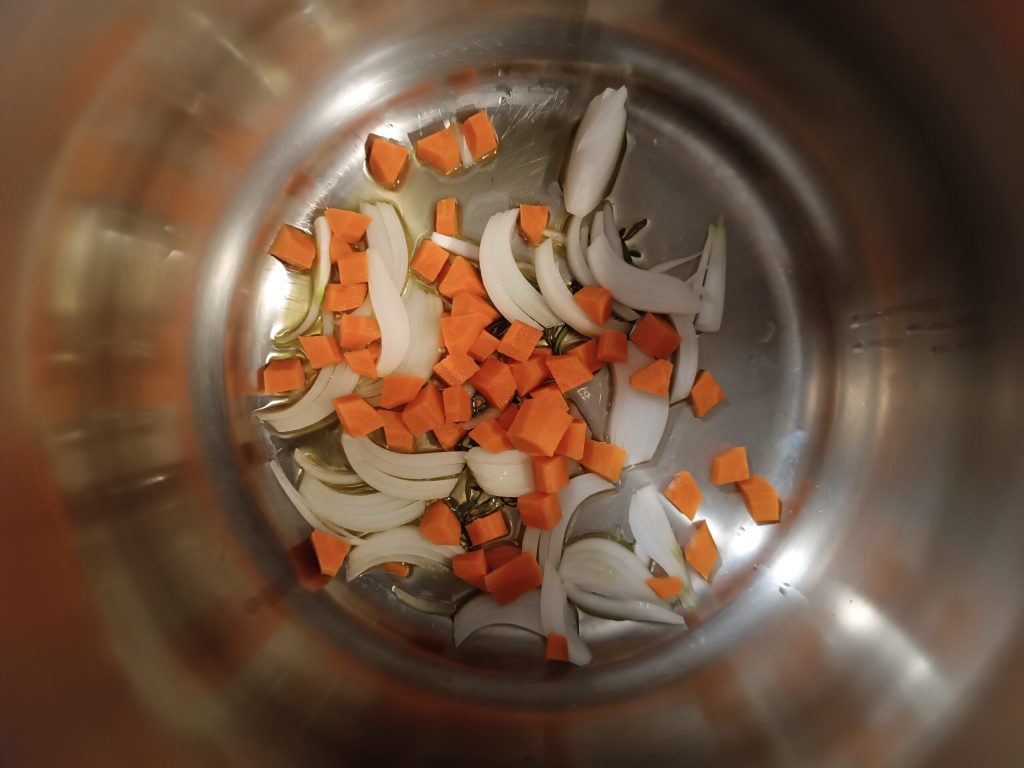 • Lo primero que deberéis hacer es remojar los garbanzos y las castañas en agua fresca y un poco de bicarbonato, durante toda la noche. Antes de comenzar la cocción, aseguraos de enjuagar todo. Y ahora podéis proceder. Poned las verduras para el sofrito (zanahoria, apio y cebolla) cortadas en trozos, en poco aceite, añadid también romero y tomillo, dejad sofreír y…