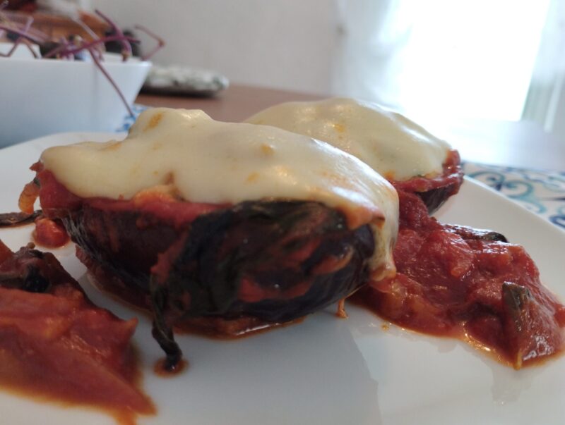 • Al final de la cocción, poner una rebanada de provola sobre cada berenjena, dejar derretir y servir