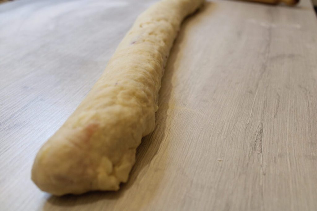Una vez obtenido el cilindro, cortar en trozos y obtener las bolitas que haréis fermentar en el horno con la ayuda de un cazo con agua hirviendo, que os servirá para crear calor y humedad.