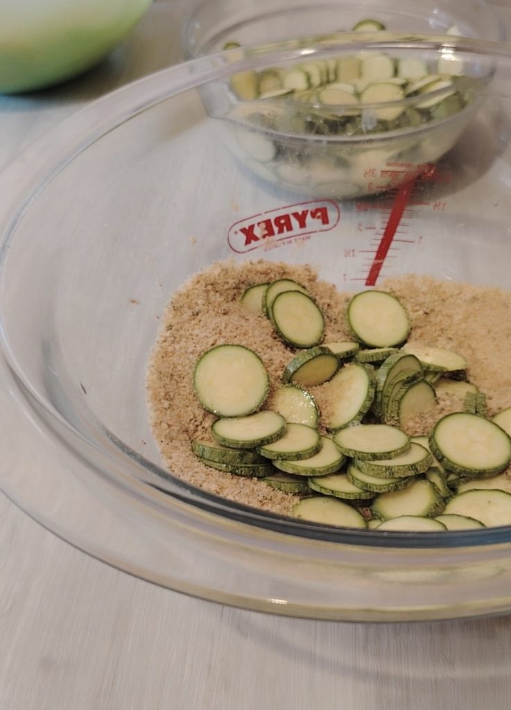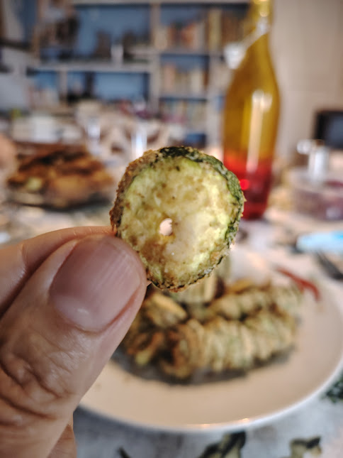 Ahora pasa los calabacines escurridos un poco y empaniza rápidamente; agotados todos los ingredientes…