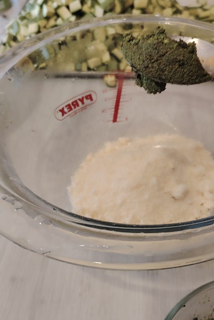 Añade el pan rallado, el queso, la albahaca, la mía estaba en pasta porque estaba haciendo otras preparaciones, el ajo picado finamente, una pizca de sal y mezcla bien.