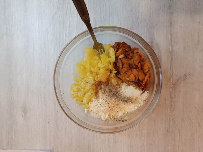 Tras haber hervido las patatas, peladlas y añadidlas a la calabaza y speck en un bol, agregad el parmesano y una pizca de pimienta negra; trabajad para mezclar todo después de haber aplastado las patatas y la calabaza con un tenedor. Preferí dejar el relleno no demasiado fino para poder sentir las diferencias de sabor en los ingredientes y no hacer un puré homogéneo.