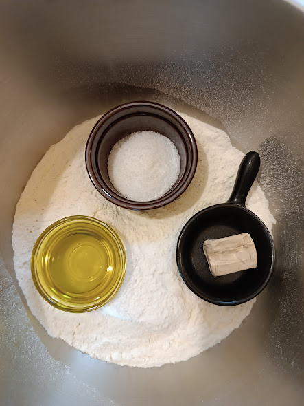 • Por la mañana, para la cena de la noche. Poner los ingredientes en un bol o en la amasadora: harina, malta (a falta de esta, sustituir con azúcar), la sal y mezclar bien. Añadir por último el aceite y luego añadir el agua después de haber disuelto la levadura en ella. Amasar bien durante al menos 5 minutos y dejar reposar hasta la noche en un lugar no muy cálido.