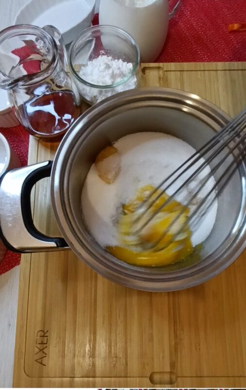 • Prepara los ingredientes cerca del lugar de trabajo, vierte las yemas y el azúcar y comienza a mezclar bien, sin montar…