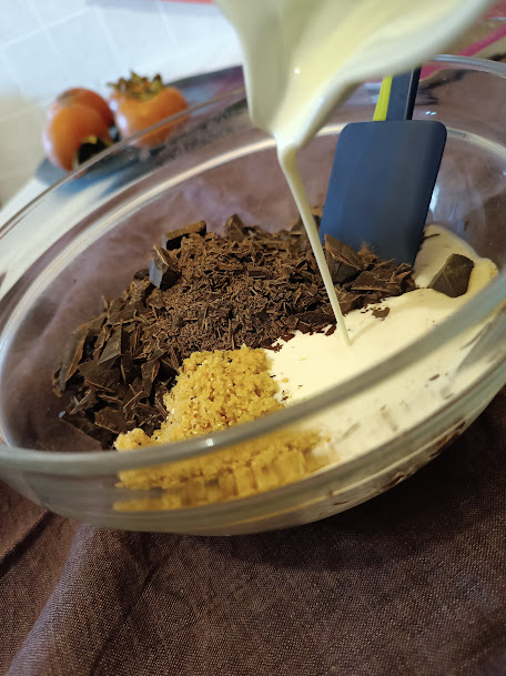 • En un bol, une el chocolate cortado en láminas, la mezcla aromática y la nata calentada a unos 80 grados; mezcla con cuidado hasta obtener una mezcla homogénea. Si es necesario, pasa unos segundos más en el microondas. Obtendrás así un chocolate suave y brillante.