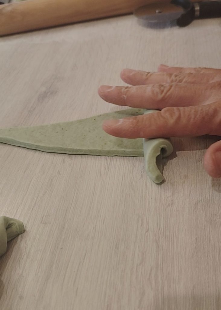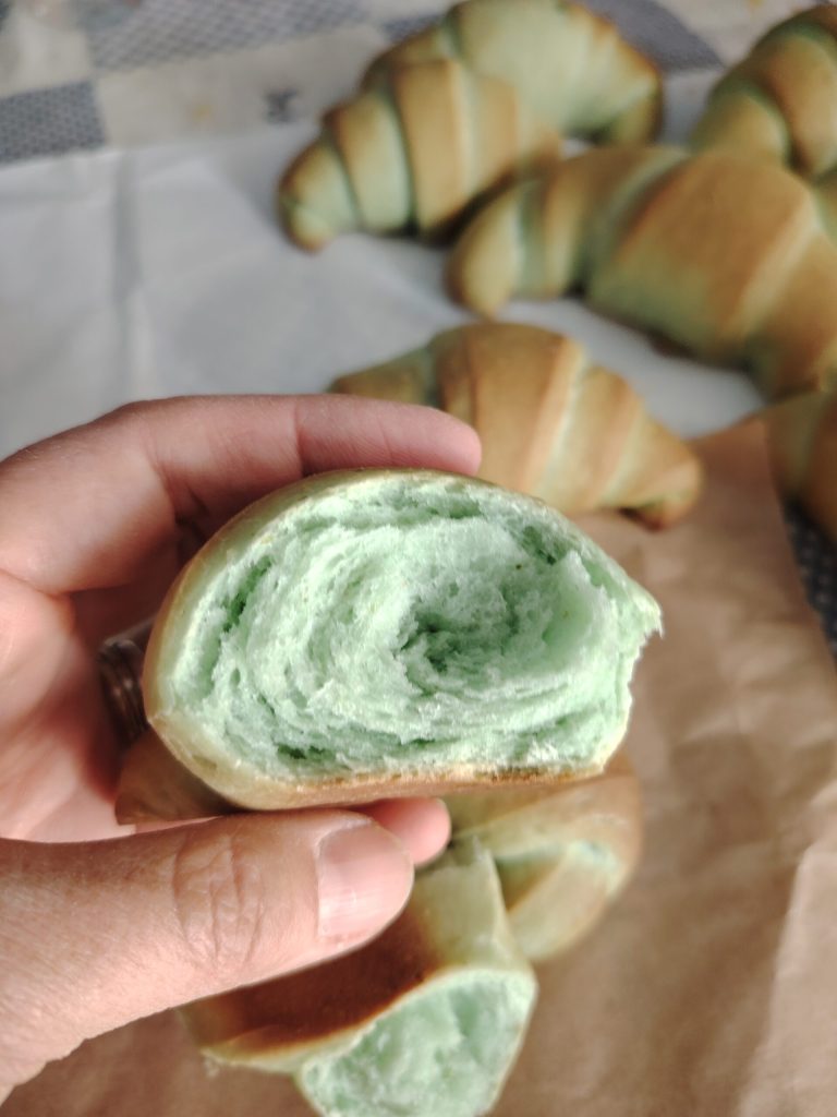 Croissants dulces facilísimos y verdes. Ideales para entrantes y buffets, para evitar el típico bocadillo. Para colorear las fiestas de los más pequeños, para una mesa sabrosa. Con la misma masa, puedes dar diferentes formas. La coloración es totalmente natural, perejil y albahaca finamente triturados, amarillo con cúrcuma, marrón con cacao.