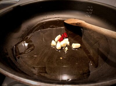 Como primera operación, sofríe ajo y guindilla en poco aceite, no debes tostarlo porque se vuelve amargo