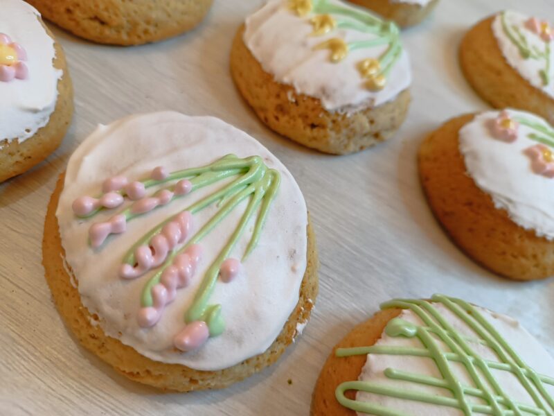 He preparado unas galletas simples; Las galletas que de niña comía precisamente en ocasión de la Pascua, utilizando mis ingredientes básicos clásicos: harina, huevos, mantequilla, azúcar y obviamente las avellanas. El resultado es una galleta quebradiza y fragante, decorada con un glaseado real y dibujos con tema Pascual. Creo que pueden ser una excelente idea como detalle para Pascua, especialmente para los niños que no aman el chocolate. Es un pequeño detalle dulce y delicioso, que puede ser apreciado por todos.