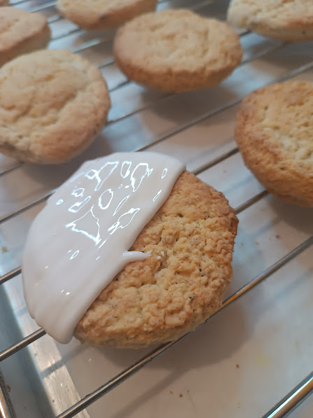 Con el rodillo estirad la masa ayudándoos con un poco de harina para que no se pegue, he utilizado un cortador de galletas de 6 cm de diámetro. Hice otras formas pero no tengo la foto. Hornead en horno ya caliente y colocadlas listas para glasear