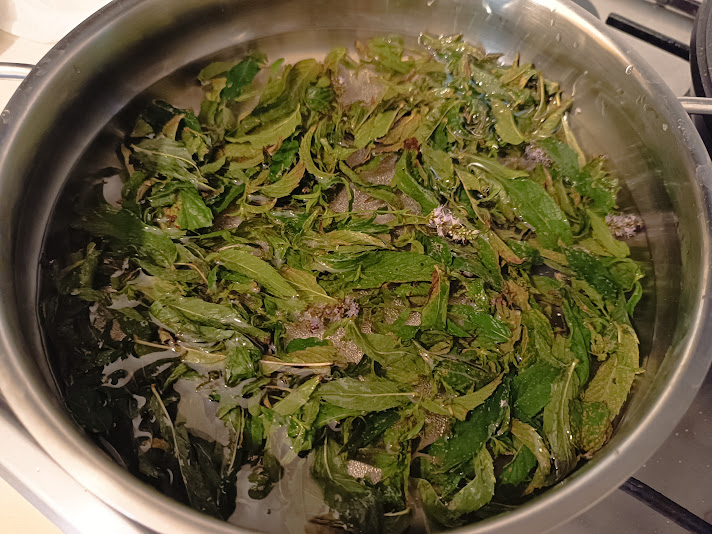 • Limpia bien todas las hojas de cualquier impureza. Ponlas a hervir con el agua y el azúcar, mientras tanto, remoja la gelatina en un poco de agua fría