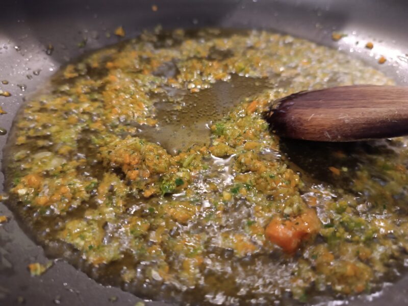Dorad el sofrito en poco aceite, sabéis que no soy amante de las grasas, uso muy poco condimento…