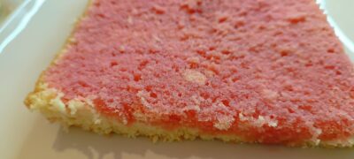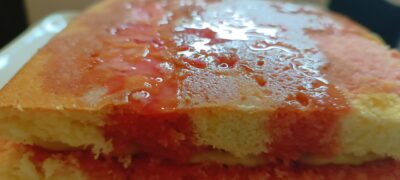 Ahora podemos ensamblar la zuppa… Corta a la mitad tu bizcocho y empápalo con el alchermes. Yo personalmente lo he diluido con un poco de agua para darle un sabor más suave, si en cambio queréis un resultado más decidido usadlo en pureza.