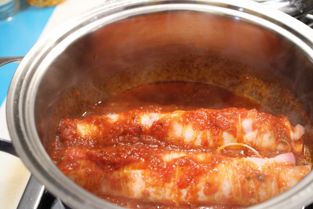 • En este punto, transfiérelas a la cazuela con la salsa. Cocínelas a fuego lento hasta obtener una braciola suave.