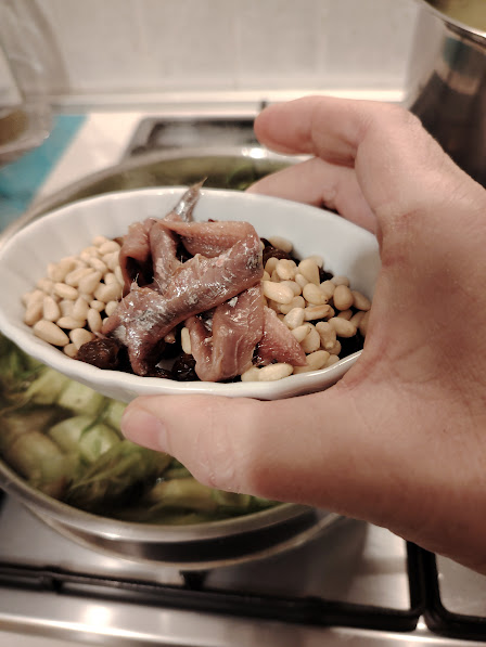 • Después de limpiar las puntarelle, córtalas en tiritas y blanquéalas en agua salada, que luego usarás para cocer los longarini. Transfiérelas a una sartén con aceite de oliva, y después de dorarlas un poco, añade las anchoas desespinadas, las pasas y los piñones. Diez minutos de cocción y apaga el gas.