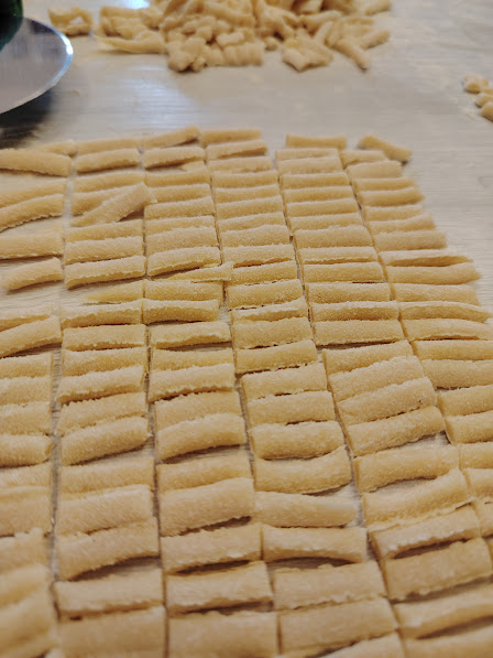 • Estira con el rodillo hasta obtener un grosor de aproximadamente tres mm, y corta en pequeñas tiras, como ves en la foto. Si tienes el rodillo acanalado es perfecto. Mantén una longitud de la pasta de unos 15 cm.