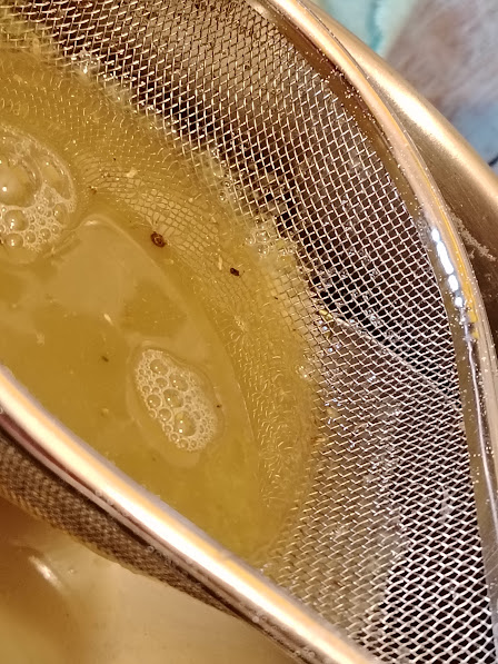 • Transfiere a una olla y cocina lentamente hasta reducir el mosto a casi un tercio del volumen. Después de alcanzar la mitad del volumen, haz la prueba enfriando una cucharada de jugo en un platillo hasta alcanzar la densidad deseada. Yo lo hice en dos versiones diferentes.