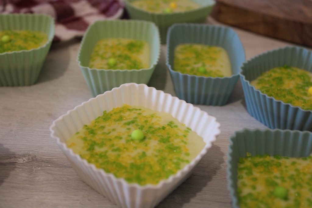• En el bol o en la batidora, mezclar la harina y la levadura tamizadas juntas, el azúcar y finalmente los calabacines con el yogur, el aceite y la leche. Mezclar bien y transferir a los moldes.