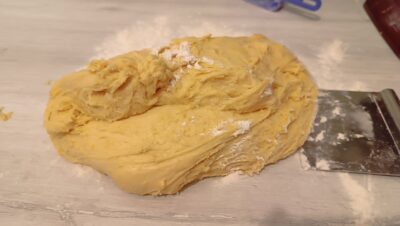 • En la batidora o en un recipiente grande, poned la harina, la leche templada con la levadura, el azúcar y comenzad a amasar. Después, añadid los huevos uno a uno y amasad bien. Finalizado este paso, añadid los aromas y la mantequilla ablandada y cortada en pequeños trozos. Amasad hasta que se absorba todo y no se pegue a las manos. Si lo hacéis en la batidora, veréis que se despega de las paredes. Dejad reposar para que leve, yo utilizo el horno con un cazo de agua hirviendo para crear humedad y calor. Dejad duplicar su volumen, aproximadamente dos horas. Si queréis, podéis hacer una larga fermentación, dejando la masa una noche en la nevera. Os aseguro que el resultado será aún mejor.