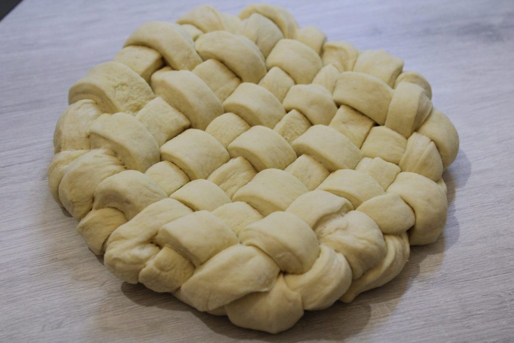 • Con la ayuda del rodillo, extender la masa y formar tiras y crear una panella como se ve en la foto.